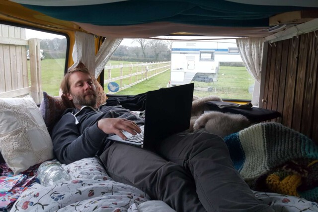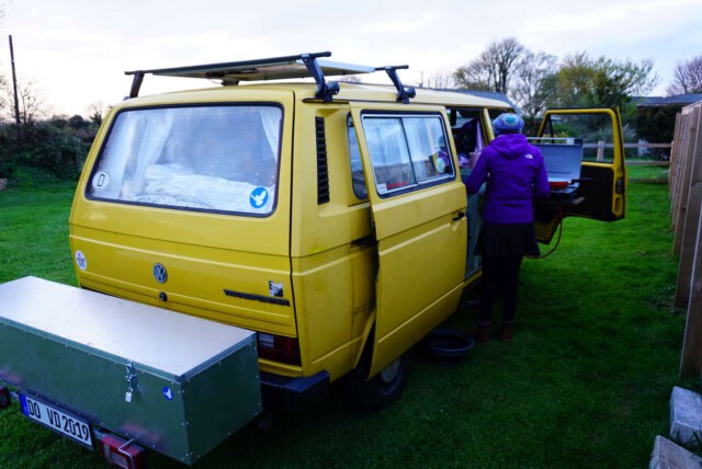Da die Fahrt etwas länger dauerte, kamen wir erst spät in der Nähe von Falmouth an. Chefnavigator Vicky suchte uns eine süße kleine Farm aus, die auch Campern einen Stellplatz bot. Ganz oben auf einem 2nd gear* Hügel liegt die Tregunwith Farm. *das ist die neue Einheit für die Steilheit der Hügel. 2nd gear bedeutet, dass man mit dem Bulli bis in den zweiten Gang runterschalten muss, um dort hinauf zu kommen 😀