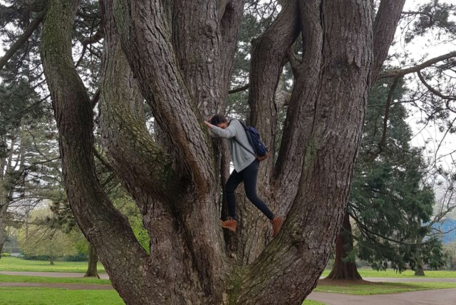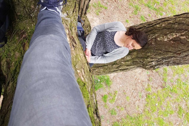 Am nächsten Morgen begann unsere Suche nach einer Wäscherei, oder einer „Laundrette“, wie der Engländer zu sagen pflegt. Mittels Google Maps steuerten wir ein solches Etablissement an. Google führte uns direkt ins dunkelste Ghetto von Newport. Allerfeinste Dortmund-Nordstadt- oder Essen-Altenessen-Atmosphäre. Zum Glück war ein Parkplatz direkt vor dem Waschsalon frei. Denn den Bulli hätten wir dort nicht länger als zwei Minuten aus den Augen gelassen. Nicht nur, dass der gelbe Bulli mit der Heckbox so schon auffällig genug wäre, das deutsche Kennzeichen enttarnte uns auch direkt als Touristen. Etwas beschämt ertappten wir uns dabei, von falschen Vorurteilen erfüllt zu sein. Shame on us! Nachdem wir die Wäsche abgekippt hatten fuhren wir zum nächsten Krankenhaus. Keine Panik, es gab keine Verletzten, aber auf der Suche nach einem Ort für Körperhygiene kamen wir dort vorbei und dachten: „Da gibt es sicherlich halbwegs gepflegte Toiletten, wo man sich auch Zähne putzen und durchs Gesicht waschen kann.“ Um die Zeit bis zum Fertig werden der Wäsche zu überbrücken spazierten wir durch einen Park und kletterten dort auf Bäumen rum.