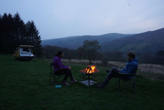 Nach soviel Wasser war uns wieder nach Feuer zumute. Deshalb checkten wir das Internetz abermals nach einer Farm, bei der man Feuer machen dürfte. Vicky wurde schnell fündig und so ging es wieder mal aufs Land, einen Berg hinauf, diesmal sogar bis zu 1st gear Steigungen. Die Farm lag inmitten wunderschöner Landschaft und am Fuße der Beacons. Von hier aus konnte man zahlreiche Gipfel erreichen, unter anderem den höchsten Berg des Nationalparks, den Pen y Fan. Das Wetter versprach warme Sonnenstrahlen ohne Ende. Trotzdem machten wir zuerst mal einen lazy day: einen Tag, an dem wir eigentlich gar nichts machen wollten. Wir chillten am Bulli rum und genossen das fantastische Wetter. Na gut, Deedee hat dann doch noch etwas an der Elektrik von Hermis rumgebastelt und die Sitzverstellungen geschmiert, während Vicky es vorzog sich einen leichten Sonnenbrand zuzulegen. Steht ihr gut 😛
