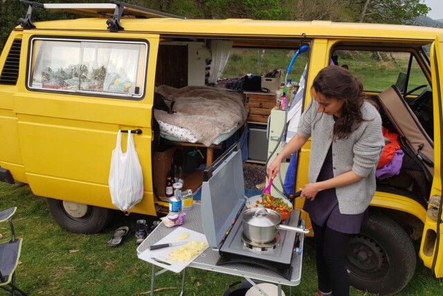 Neben uns machten sich einige mutige Bergsteiger daran, ihre Zelte aufzubauen oder versuchten, diese vor dem Wegfliegen zu retten. Bei dem immer mehr aufkommenden Starkregen und dem böenartigen Wind empfanden wir großen Mitleid mit ihnen. Wir selbst verkrochen uns mit Gasflasche und Kocher in den Küchen-/Duschraum, da das Kochen draußen bzw. im Bulli aufgrund des Wetters nicht möglich war.