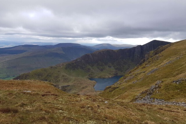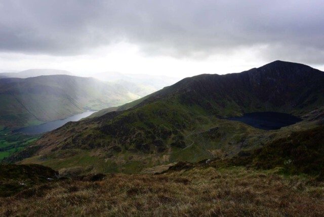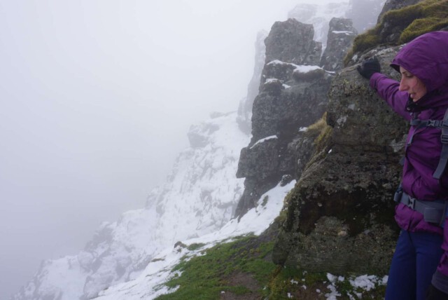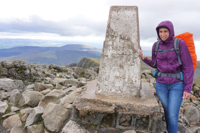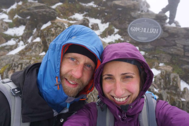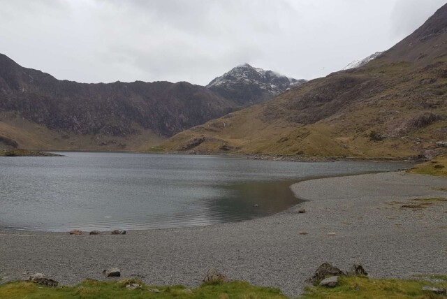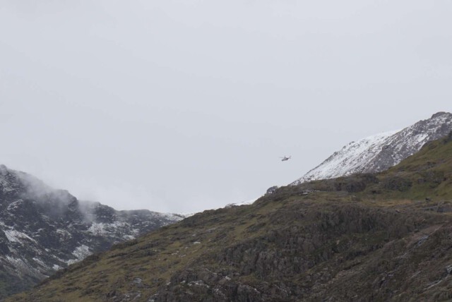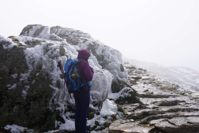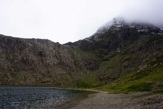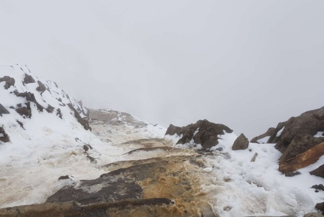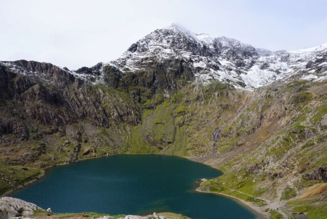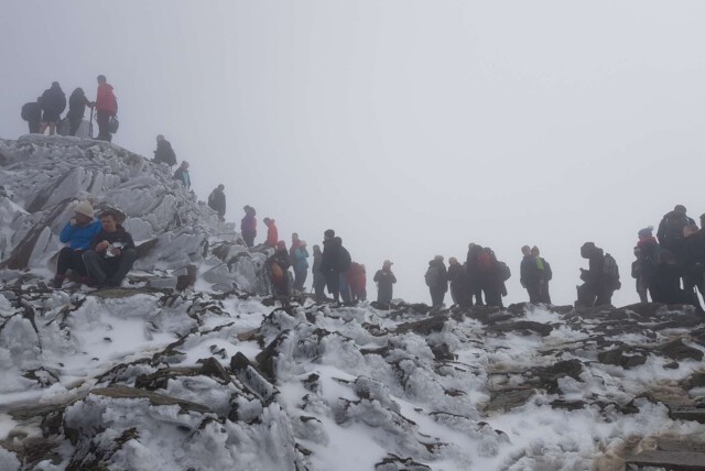 Der Track startete mit einem schönen Anstieg durch Wiesen entlang eines Bergrückens und führte dann oberhalb zweier Seen auf schotterigen Pfaden weiter. Nach einer Weile kommt man um einen Vorsprung herum und sieht zum ersten mal den wirklich imposanten Gipfel. Was für ein Anblick! Wunderschön, aber auch respekteinflößend. Der Weg verläuft gegenüber des Gipfelmassivs und mündet dann in einem knackigen Anstieg über Felsen zur Scharte. Hier begegnete uns auch bereits der erste Schnee. Auch hier wurde es richtig kalt, je höher man kam. Aber diesmal waren wir vorbereitet: mit ausreichend Kleidungsschichten, Handschuhen und Mütze trotzten wir dem rauen Klima. Die letzten Meter zur Scharte hoch verlangten einem nochmal einiges an Mut und Kondition ab, von da aus ist es eigentlich ein Spaziergang zum Gipfel. Hier treffen auch die anderen Tracks aufeinander, sodass es ab hier voll wird auf dem Weg. Zugegeben: was sollte man erwarten, wenn man auf einem Sonntag auf einen begehrten Berg geht (höchster Berg Englands), der noch dazu nach einer längeren Regenzeit mit einer guten Wettervorhersage lockt? Dementsprechend gestalteten sich dann auch die letzten Meter bis zum Top. Viele Wanderer trotteten die großen Felsstufen hoch. Auf dem Gipfel steht ein kleines Plateu, auf das man über eine Treppe gelangt. Wir glaubten unseren Augen nicht, aber hier standen die Leute schon in einer Schlange an!! Das war uns dann endgültig zu viel. Zudem gibt es dort oben, direkt am Gipfel, die Bergstation einer Zahnradbahn. Dieses Gebäude wird mit Hilfe von Dieselgeneratoren mit Strom versorgt, welche ihre Abgase schön in die Luft pusten. Das ‚erhebende Gefühl einer Gipfelbesteigung‘ war damit endgültig weggeblasen. Diese Menschen, muss das denn wirklich sein?! Somit machten wir uns mit sehr gemischten Gefühlen auf den Rückweg. Obwohl wir uns selbst natürlich auch als Touristen betrachten, war der Ansturm auf den Berg für uns sehr erschreckend und betrübte das Naturerlebnis immens. Anstatt sich umzusehen, die Natur auf sich wirken zu lassen, sich auf ihre Schönheit einzulassen, sie einzuatmen, zu hören, zu tasten, wurde unser Fokus in Richtung der strömenden Masse gelenkt, auf ihre lauten Gespräche und ihr Lachen. Wir waren mehr damit beschäftigt, auf den „Verkehr“ zu achten, als auf unsere Füße. Wir waren genervt von den Turnschuh-Trägern, die mehrmals fielen, da sie an den glatten und nassen Felsen und Steinen ausrutschten. Wir waren genervt, an den schönen Rastplätzen an den Bergseen Müll vorzufinden. Der Respekt vor der Natur scheint erloschen, sobald sie zur Massenbespaßung benutzt wird. Als wir schon auf halbem Weg runter waren, sahen wir noch, wie ein Rettungshubschrauber zur Scharte hoch flog, um dort einen Verunglückten zu retten.