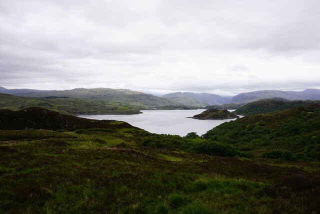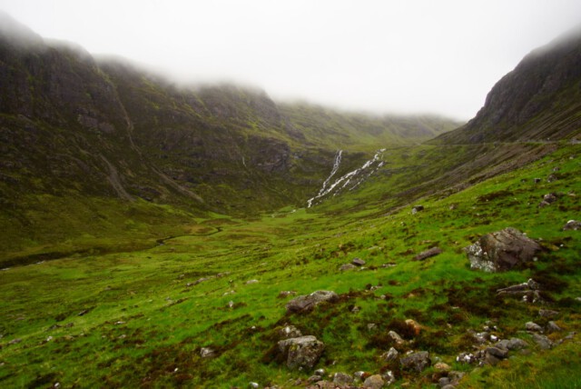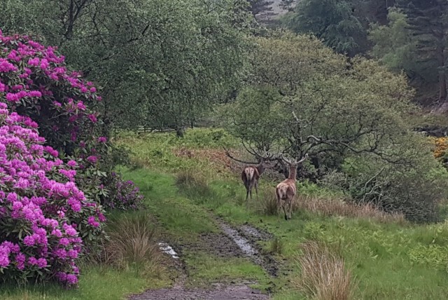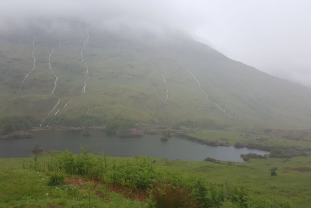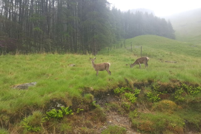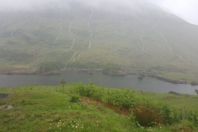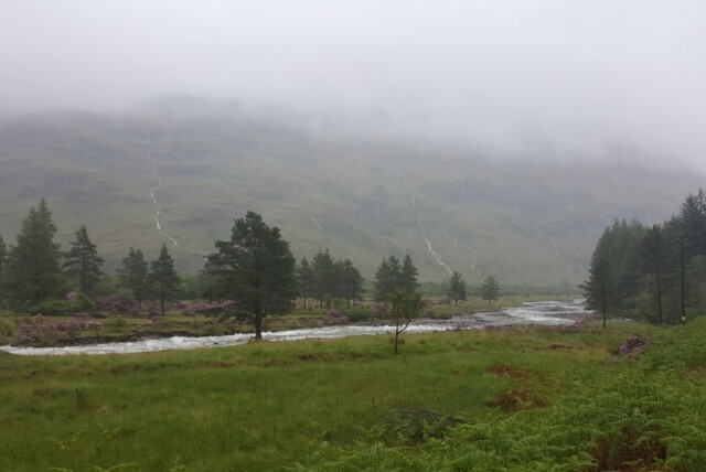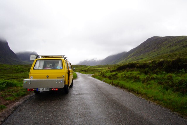 Aufgrund des anhaltenden Regens sind wir am nächsten Tag wieder aufgebrochen und haben uns das spektakuläre Tal „Glen Etive“ angeschaut. Auf einer winzigen Single Track Road quälte sich Hermis immer weiter in das Tal entlang des River Etive. Durch den Dauerregen schossen von allen Seiten zahllose Bäche die Berge herab. Uns begegneten Rehe, Schafe, gelber Stechginster und strahlend rosaner Rhododendron. Ganz am Ende des Tals ist ein See, an dem eine Szene von James Bond Skyfall gedreht wurde. Passend zu einer kleinen Regenpause kamen wir dort an und trauten uns zu einem kurzen Spaziergang aus dem Bulli.