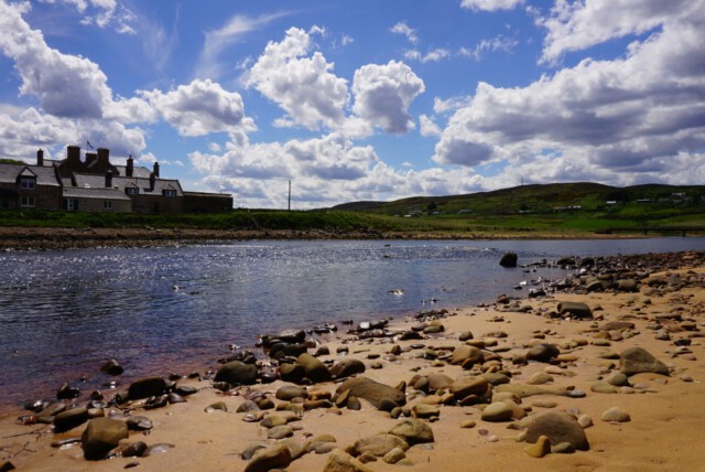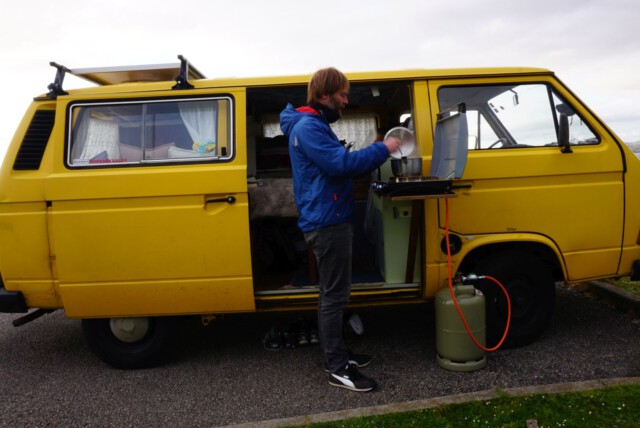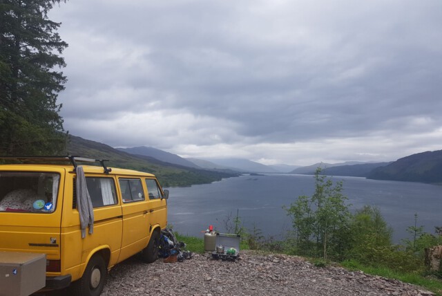 Im letzten Beitrag hatten wir ja schon erwähnt, dass Schottland uns mit wundervollem Sonnenschein empfangen hatte. Da die Fährüberfahrt über Nacht ging, holten wir direkt am Fährhafen etwas von dem fehlenden Schlaf nach und machten uns dann auf nach Ayr, denn wir mussten noch immer unser Gasproblem lösen. Aber auch hier haben wir keine Füllstation finden können. Also fuhren wir weiter nach Glasgow. Dort klappapperten wir wieder diverse Läden ab, aber so sehr sich die Leute auch Mühe gaben, niemand konnte unsere Flasche füllen. Das alte Spielchen begann von Neuem: „Ne, wir füllen nicht (mehr), aber versucht es vielleicht mal hier und dort.“ Wir waren inzwischen echt mega genervt, denn die Suche nach einem Gasabfüller nahm inzwischen einen Großteil unserer Tage ein. Auf einen dieser vielen gut gemeinten Tipps hin besuchten wir einen Wohnmobilhändler, der uns zwar auch nicht mit unserer 5 kg Flasche weiterhelfen konnte, wo aber ein Mechaniker auf einmal eine volle deutsche 11 kg Flasche aus dem Ärmel zauberte. Und nicht nur das, er hat sie uns auch noch geschenkt! Denn einer seiner Kunden hatte auf das britische Gassystem gewechselt und er konnte mit der Flasche eh nix anfangen. Somit hatten wir zunächst erstmal wieder mehr als ausreichend Gas. Jedoch startete dann ein stundenlanges Tetris-Spiel bei welchem wir versuchten, die große Flasche irgendwie in den Bulli zu integrieren. Aber es fand sich kein guter Platz dafür. Das Ding musste erstmal halbwegs ungesichert vor der Küchenzeile Platz nehmen. Aus Gründen der Sicherheit (safety first) waren wir mit dieser Lösung aber nicht gerade zufrieden. Also machten wir einen letzten Versuch bei einem Gasdealer, da wir in dem Fall, dass auch dieser unsere kleine Flasche nicht füllen kann, darüber nachdachten, uns eine kleine britische Flasche zuzulegen, die dann wieder sicher verzurrt im Gasschrank unterkommen könnte. Natürlich konnten wir auch dort keine Füllung bekommen und der Umstieg auf das britische System hätte über 75 Pfund gekostet und wir hätten unsere deutsche Flasche auf den Müll schmeissen müssen. Und drei Wochen später in Skandinavien würden wir wieder vor dem gleichen Problem stehen. Also sind wir seitdem wohl oder übel mit der großen Flasche an Bord unterwegs. Manchmal ist es doof, wenn man so klein ist und so wenig Platz hat.