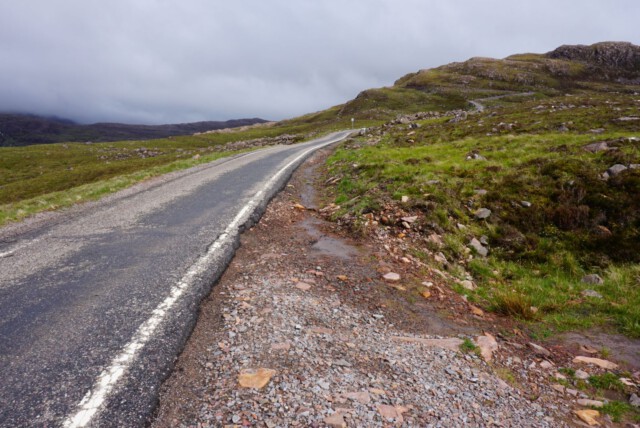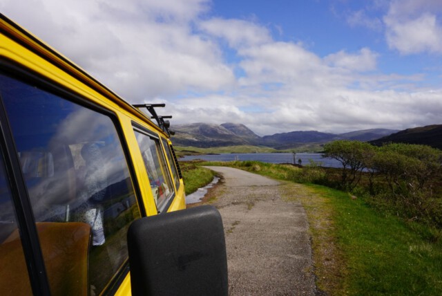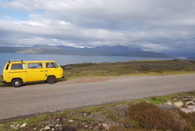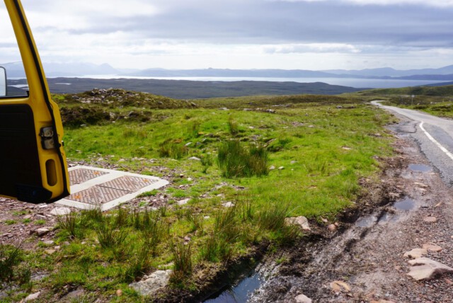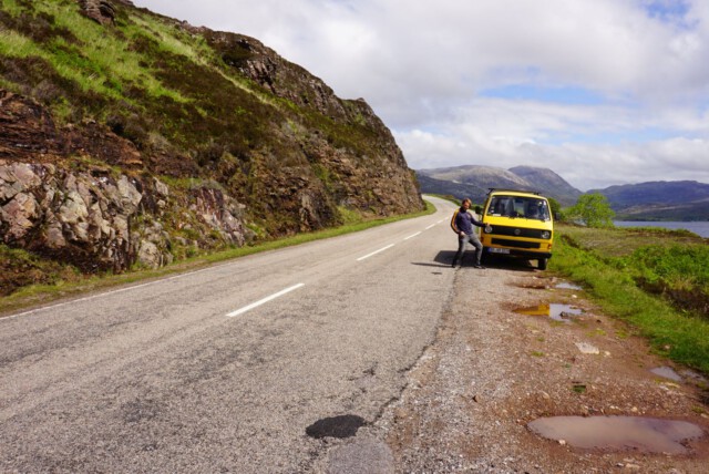 Wir vebrachten sieben Tage an schottlands Nordküste. Am anstrengendsten war dieser Abschnitt mit Abstand für Bulli. Steigungen von über 25% rauf und runter, ständiges Stoppen und wieder Anfahren auf den schmalen Single-Track-Roads, wenn man dem Gegenverkehr ausweichen muss, was sich auch im Spritverbrauch niederschlug: auf der Autobahn verbraucht Hermis 6,1 l/100 km, auf den NC 500 ging es bis auf 8,1 l/100 km rauf. Eine Passstraße ist uns dabei besonders in Erinnerung geblieben: die Passstraße vor Applecross, auf der wir immer weiter und steiler bis hoch hinauf in die Wolken kletterten. Die Sichtweite war zum Teil unter 30 m und es war wirklich gruselig dort oben.