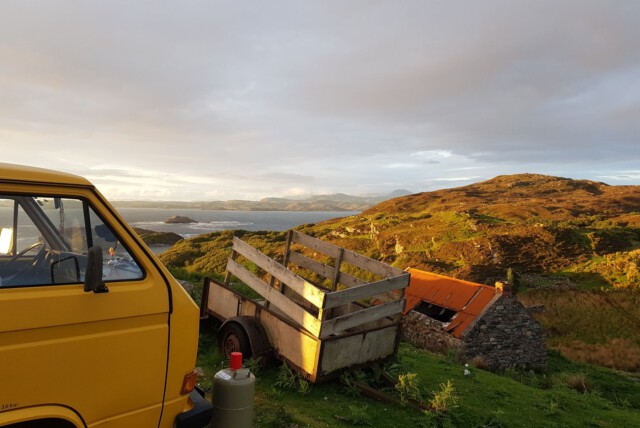 Als wir das schöne Tal erreichten, steuerten wir den von Peter empfohlenen Stellplatz in der Nähe des ehemaligen Visitorcenters an und trafen dort auf viele andere Camper, die dort bereits ihr Nachtlager aufgeschlagen hatten. Darunter ein Paar aus Schweden, die uns auf ein Bier zu sich in ihren Bulli einluden. Anette und Nisse erzählten uns, dass sie auch ein Jahr Auszeit genommen hatten, jetzt aber bereits auf dem Rückweg nach Schweden waren. Schottland war ihre letzte Station auf der Reise. Ihr Blog lautet europaexpressen.wordpress.com. Wer sein Schwedisch aufbessern will, oder einfach nur die schönen Bilder anschauen möchte, kann ihnen ja einen virtuellen Besuch abstatten. Nach dem zweiten Bier, welches natürlich aus unserer Kühlbox gesponsort wurde, luden sie uns dann auf einen Besuch, oder zumindest eine „fika“ zu sich nach Hause in Schweden ein. Ein Angebot, welches wir gerne annehmen werden.