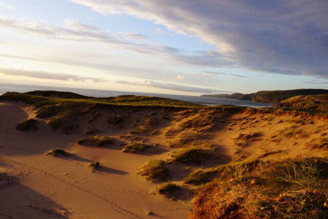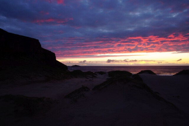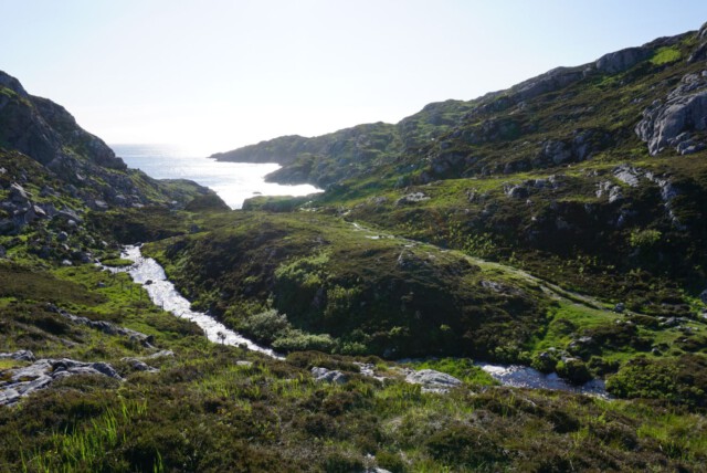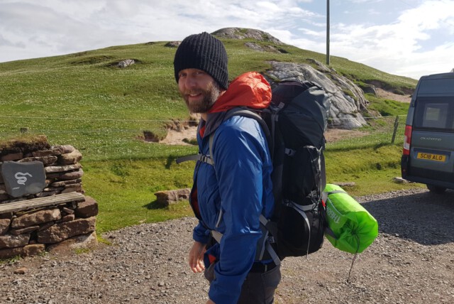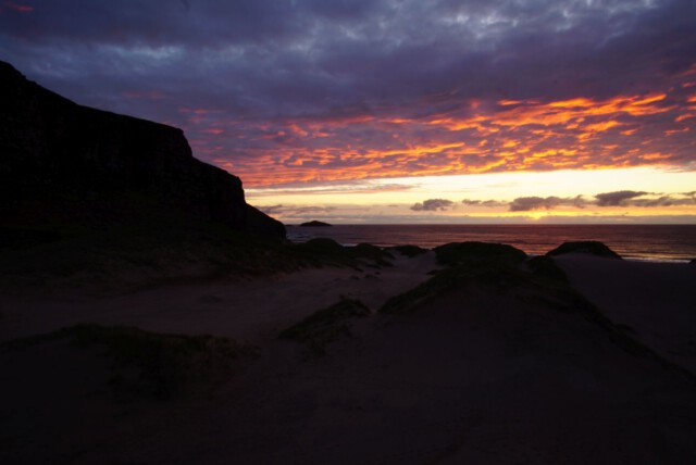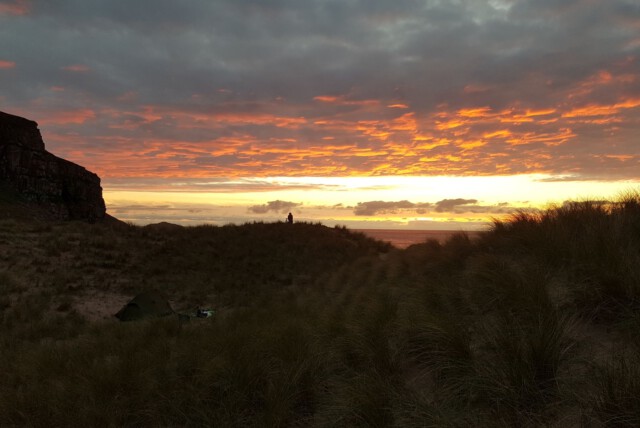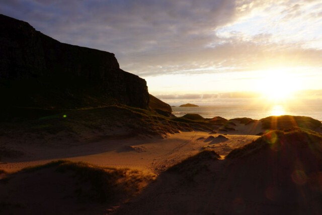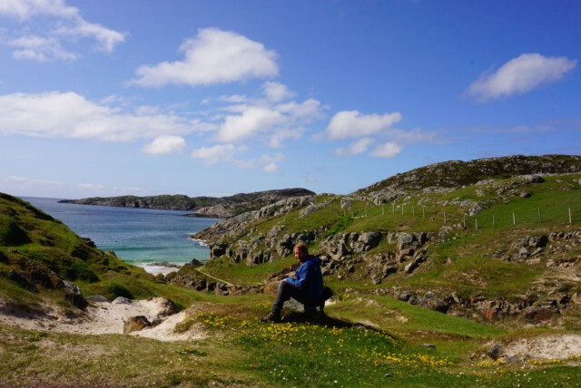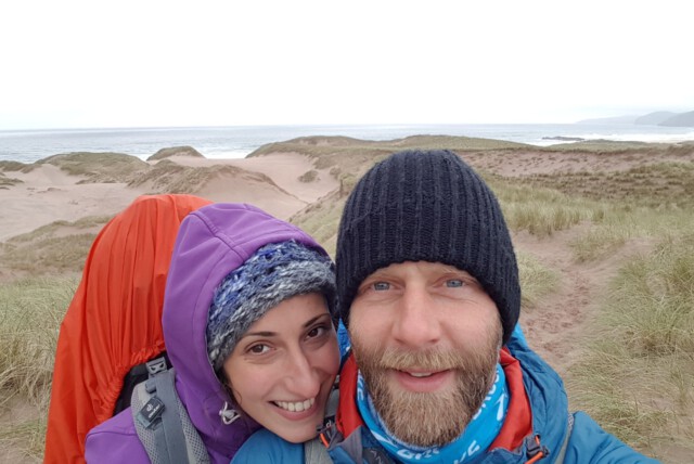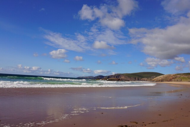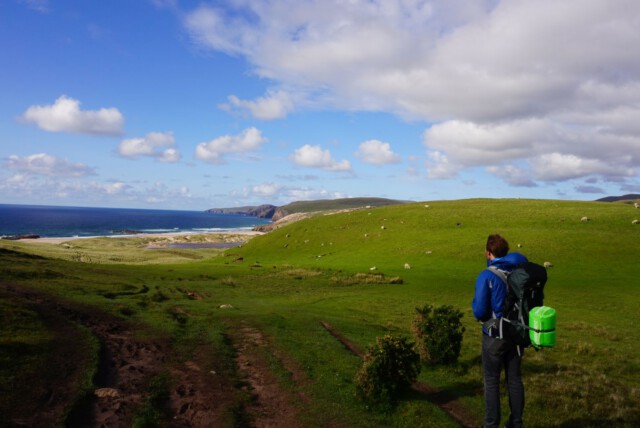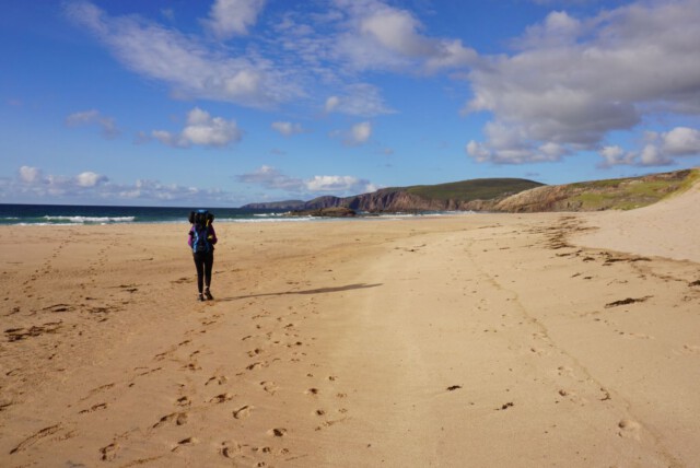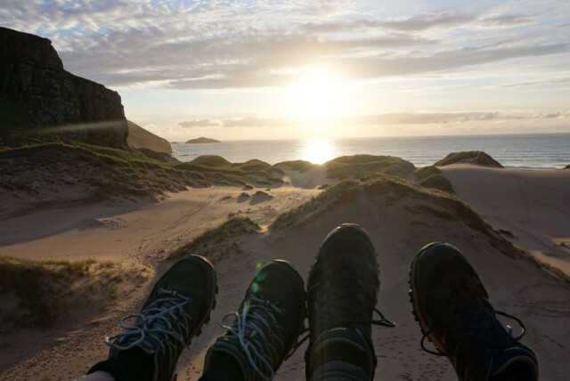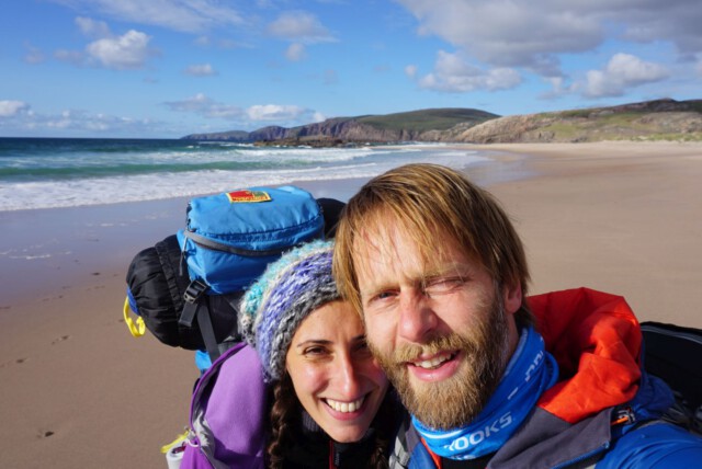 Ab und zu machten wir einen kleinen Abstecher von der offiziellen Route. Der schönste Abstecher war eine Zwei-Tages-Wanderung mit Zelt zum Sandwood Beach. Wir stellten Hermis an einem Parkplatz ab, packten unsere Rucksäcke voll mit Proviant und Campingausrüstung und wanderten durch ein schönes Tal zu einem wundervollen und abgelegenen Strand. Dort verbrachten wir einen magischen Abend am Strand mit tollem Sonnenuntergang und schlugen unser Lager inmitten der Dünen auf. Natürlich teilen wir auch hiervon gerne ein paar Bilder mit Euch: