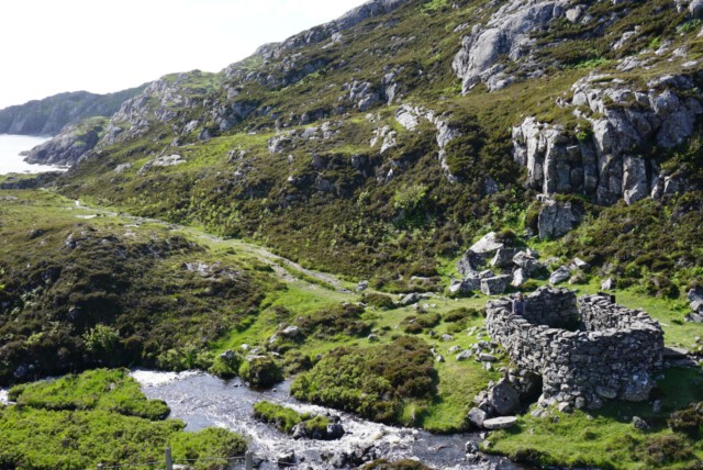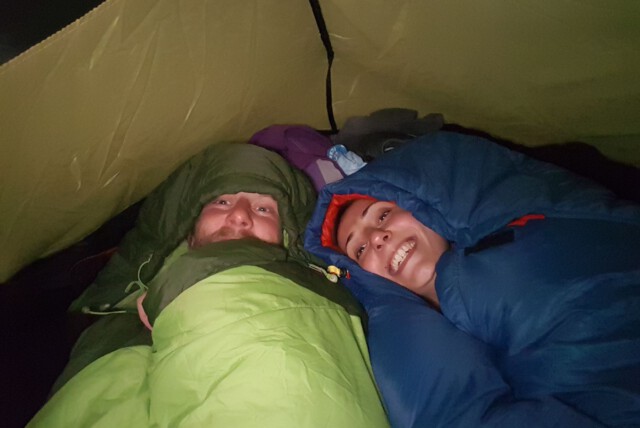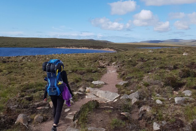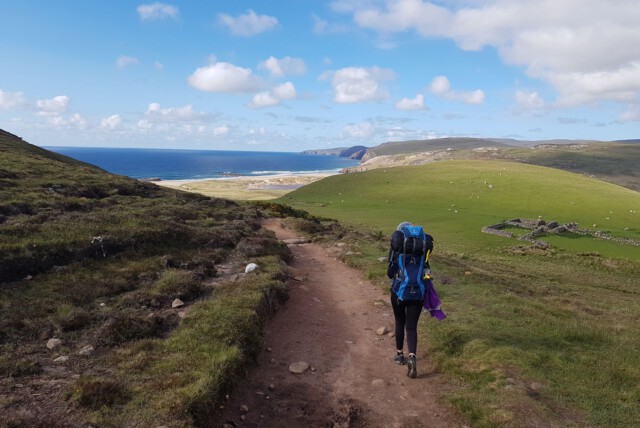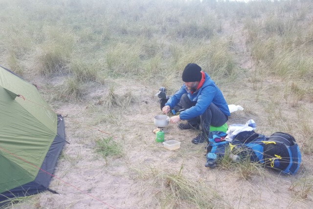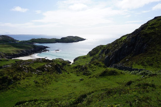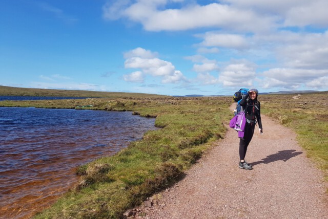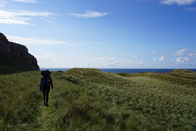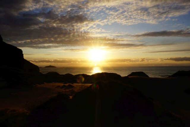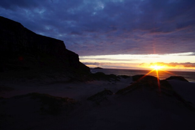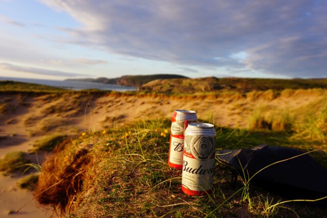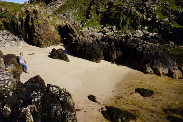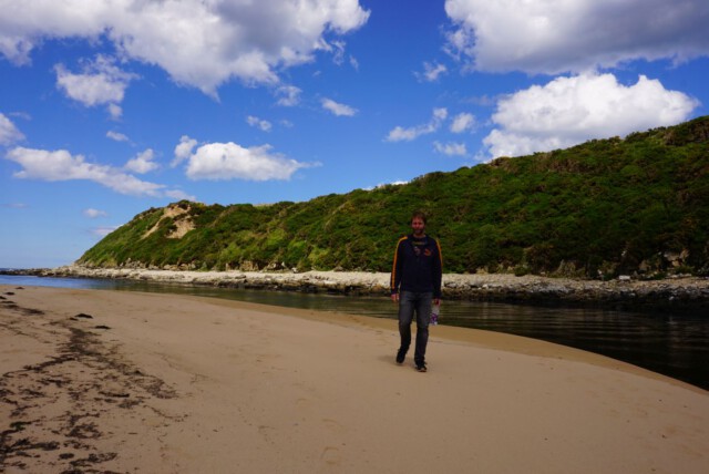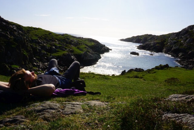 Ab und zu machten wir einen kleinen Abstecher von der offiziellen Route. Der schönste Abstecher war eine Zwei-Tages-Wanderung mit Zelt zum Sandwood Beach. Wir stellten Hermis an einem Parkplatz ab, packten unsere Rucksäcke voll mit Proviant und Campingausrüstung und wanderten durch ein schönes Tal zu einem wundervollen und abgelegenen Strand. Dort verbrachten wir einen magischen Abend am Strand mit tollem Sonnenuntergang und schlugen unser Lager inmitten der Dünen auf. Natürlich teilen wir auch hiervon gerne ein paar Bilder mit Euch:
