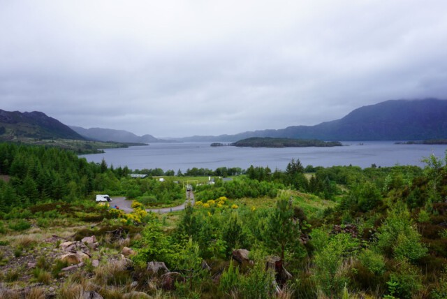 Wir verließen also Glasgow und fuhren landeinwärts in den Loch Lomond & The Trossachs National Park. Die Wettervorhersage versprach für eine ganze Woche keine guten Aussichten und so kamen wir im regnerischen Balloch an, wo wir uns am Visitorcenter mit Infos versorgen ließen.