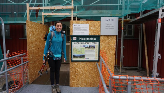 Wir stiefelten also los, um uns zunächst an der Kirche von Lillehammer unseren ersten Stempel im Pilgerpass zu holen und unsere Wasserreserven aufzufüllen. Dort „platzten“ wir in eine Hochzeit, aber zum Glück war deshalb die Kirche geöffnet und wir fanden, wonach wir suchten. Kurz danach beobachteten wir eine junge Küsterin, die große Schwierigkeiten hatte, die schwere Kirchentür zu schließen und eilten ihr zu Hilfe, womit wir uns für Stempel und Wasser revanchieren konnten.