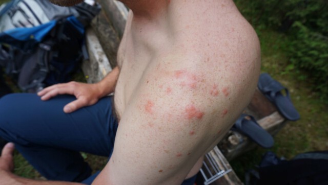 Dort fanden wir bequeme Betten vor und noch etwas viel Besseres: Kekse!!! Auf einem Regalbrettchen standen einige Lebensmittel, die käuflich erworben werden konnten. Wir kochten uns das übliche Trockenfutter und tranken Tee. Da die letzten Meter zur Hütte durch dichten Wald verliefen, warteten die Plagegeister in Form von penetranten Mücken auf uns. So mussten wir fast einen ganzen Kilometer steil bergauf in einem Sprint-ähnlichen Tempo zurücklegen. An viel mehr als die nötigste Fuß- und Mückenstichversorgung war an diesem Abend nicht mehr zu denken.