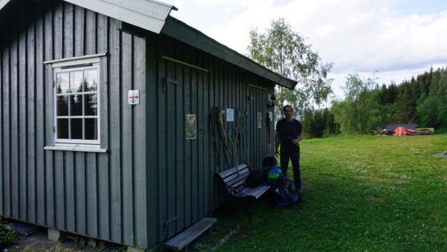 Wir stellten relativ schnell fest, dass der Wanderweg sehr viel auf asphaltierten Wegen und immer in der Nähe der Bundesstraße E6 verläuft, was uns aufgrund des Großraums Lillehammer erstmal nicht sehr wunderte. So hofften wir auf bessere Tage und fanden nach zwölf heißen und durch unser schweres Gepäck anstrengenden Kilometern auf dem Tjodveigen eine nach vorne hin offene Schutzhütte (Gapahuk), welche neben einem kleinen Tischchen über ein Bett aus Paletten verfügte. Dort ließen wir uns also für den heutigen Abend nieder und verschlangen unser köstliches, nahrhaftes Outdoorgericht. Zuvor wuschen wir uns sowie die Kleidung in einem Bach, totale Outdoor-Romantik (inklusive Mücken) 🙂