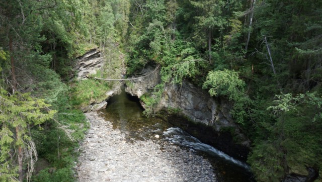 Es ging weiter über Schotter und bis auf eine kleine Schlucht mit einem wilden Fluß gab es leider wieder viel zu wenig Natur zu bestaunen. Die einzige, fast allgegenwärtige Natur waren die recht aggressiven Mücken. Diese waren nicht nur so zahlreich vorhanden, nein, sie sind auch so groß, dass sie ohne Probleme durch T-Shirts und sogar durch lange Hosen durch stechen können. Nach einiger Zeit wechselte Schotter wieder zu Asphalt und wir liefen einige Kilometer direkt über den schmalen Seitenstreifen der E6. Die Autos und LKWs zischten knapp an uns vorbei. Nicht gerade idyllisch. Die Stimmung näherte sich allmälig einem Tiefpunkt und vor allem Deedee war schwer genervt: man sieht das schöne Tal und schöne Wälder und schöne Berge, aber man läuft immer in direkter Nähe zur Bundesstraße E6 und das hautsächlich auf Asphaltstraßen und breiten Schotterwegen. Dazu ist alles unglaublich teuer. Wir hatten uns das wirklich ganz anders vorgestellt.