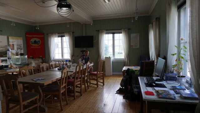 An einer Stelle waren wir uns bzgl. des weiteren Weges nicht sicher, da wir die Markierung nicht mehr entdecken konnten. Und so irrten wir ein paar Minuten umher, bis uns ein älterer Herr ansprach, zunächst auf norwegisch, und sich anschließend große Mühe gab, mit uns in englischer Sprache zu kommunizieren. Er zeigte uns erst den richtigen Weg, dann aber lud er uns auf Kaffee und Eis zu sich in sein Haus ein. Kaffee und Eis? Na, wer kann da schon „Nein“ sagen? Zunächst etwas mißtrauisch (wer hat als Kind nicht beigebracht bekommen, dass man dem fremden Onkel mit den Bonbons nicht so einfach folgt) folgten wir ihm in sein wunderschönes großes Haus.