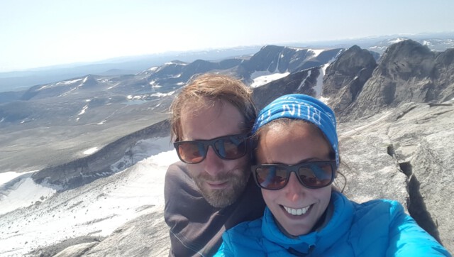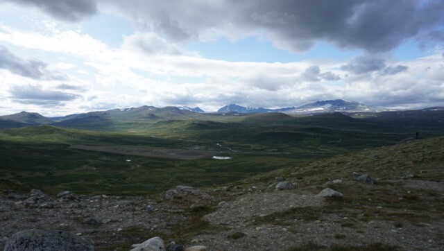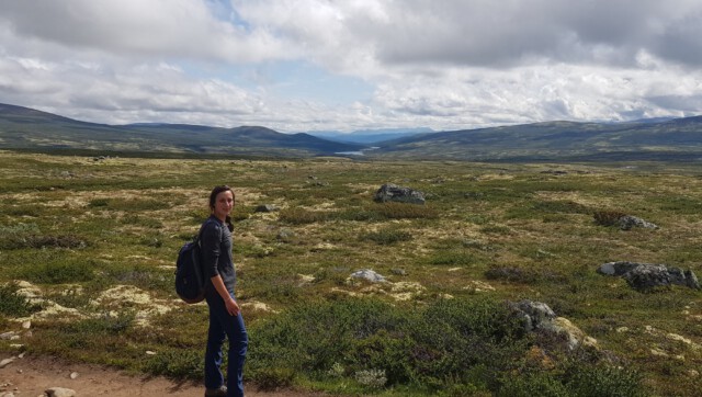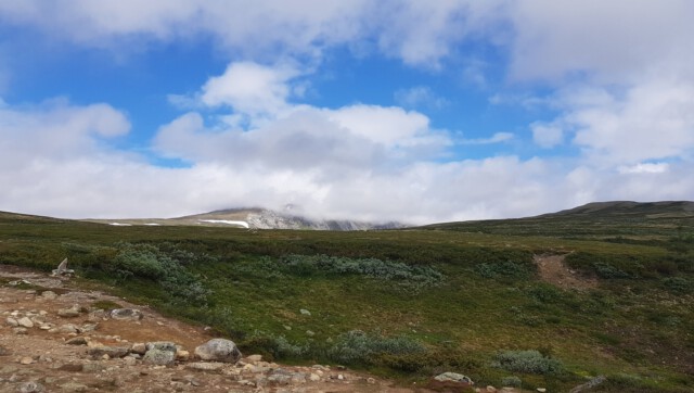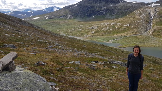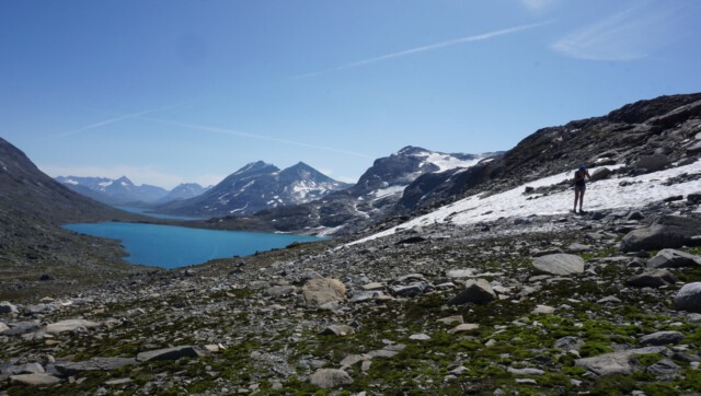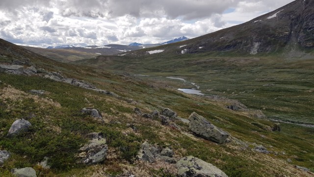 Eigentlich hatten wir nur einen etwas ausgedehnten Spaziergang geplant. Aber je weiter wir in das Fjell eintauchten, umso schöner wurde es. Wir hatten zwar wenig Wasser dabei, beschlossen aber für ein paar Schritte auf einen kleinen Trampelpfad, abseits des Hauptweges, zu wechseln. Dieser führte uns in ein wunderschönes Tal, von welchem aus wir auf die umliegende Berglandschaft blicken konnten. Zu unseren Füßen lagen zwei grüne Bergseen. Obwohl sich der kleine Trampelpfad nach und nach in Luft auflöste, machten wir aufgrund der wunderbaren Natur eine kleine ‚frei-schnauze‘ Bergetappe um den nächsten Gipfel herum. Zeitweise kamen wir uns ein wenig zwischen den Bergen verloren vor, aber Dank modernem Smartphone und GPS waren wir zuversichtlich, dieses Abenteuer überleben zu können 😉