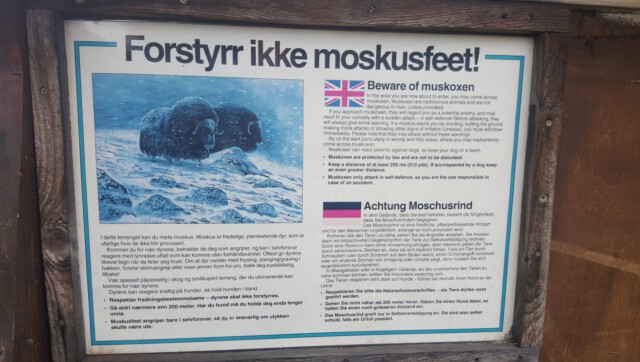Das Dovrefjell informiert seine Besucher über eine Tafel an den jeweiligen Zugängen zum Nationalpark über die hier wild lebenden Moschusochsen. Wir informierten uns hier kurz über die lustigen, haarigen Tiere, die zwar friedlich auf den Menschen reagieren, denen man aber aufgrund ihres Gewichts und ihrer Laufgeschwindigkeit von 60 km/h besser nicht blöd kommen sollte. Wir wählten also den offiziellen „Moschusochsen-Trail“, der uns durch das Fjell und zu den Moschusochsen führen sollte. Der Tag war herrlich warm und sonnig und zur Erfrischung wehte ein leichter Wind. Perfektes Wanderwetter!