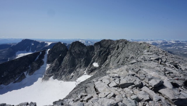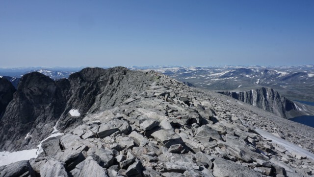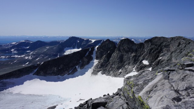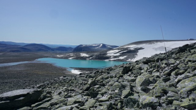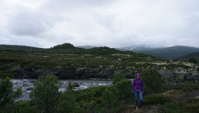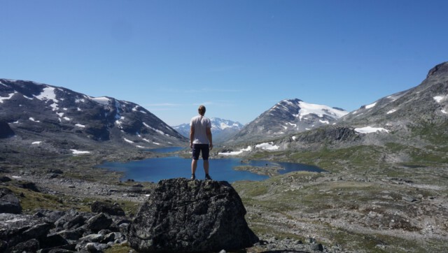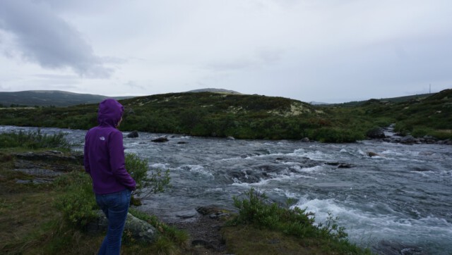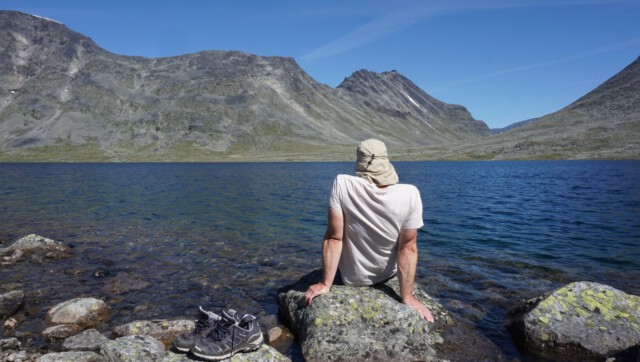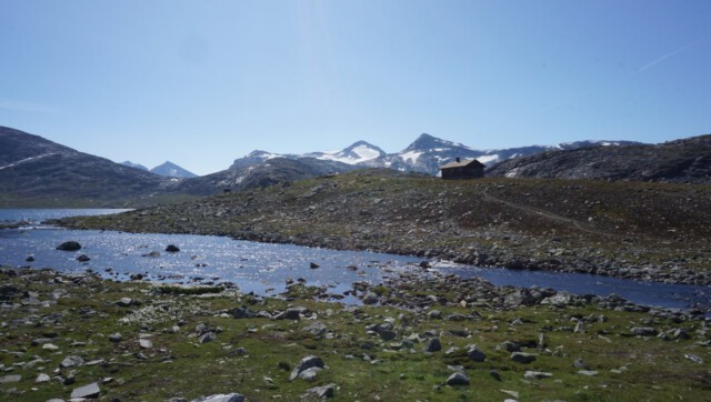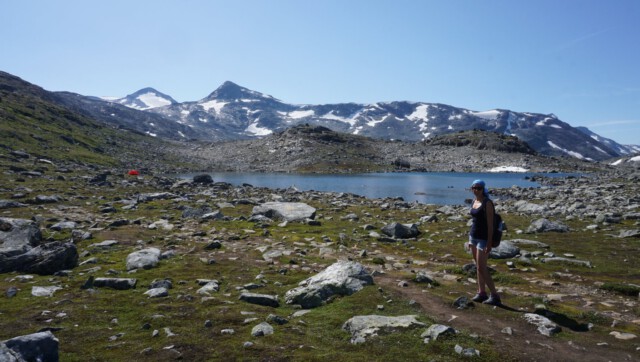 Nach drei Tagen war es nun an der Zeit, das Dovrefjell zu verlassen. Wir fuhren weiter zum Jotunheimen Nationalpark, wo die höhsten Berge Norwegens zu Hause sind. Wir bekamen den Tipp, dass eine Wanderung auf dem Besseggen Grat besonders schön sein soll und diese sogar vom National Geographic ausgezeichnet wurde. Trotz der schönen Bilder im Internet hatten wir einige Bedenken bzgl. des Schwierigkeitsgrades, der Kosten für den nötigen Bootstransfer sowie der hohen Besucherzahlen (während der Hauptsaison Juni – September über 600 Wanderer pro Tag). Wir ließen also diese Wanderung für uns ausfallen und machten stattdessen eine gemütliche Runde durch einen ruhigeren Teil des Nationalparks.