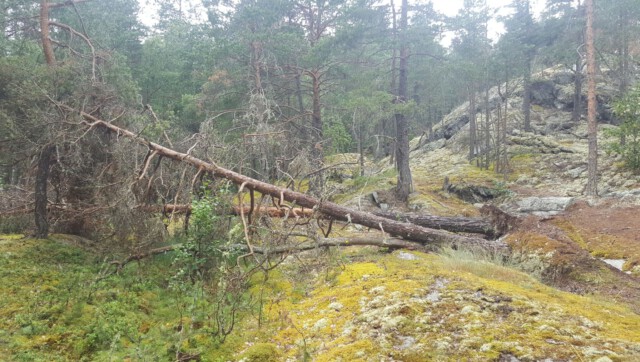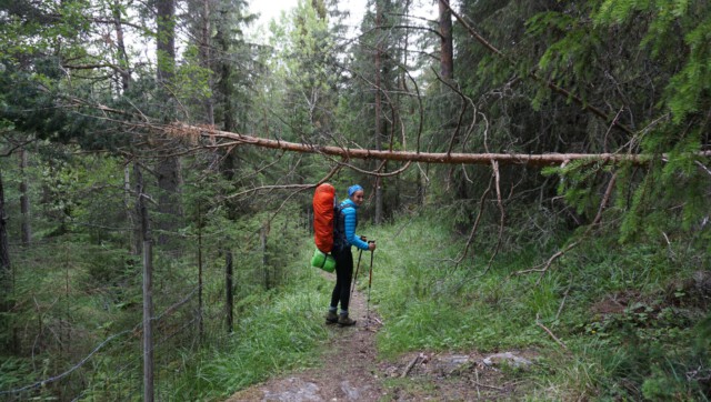 Die Nacht verlief ruhig, ohne Elche und Bären 😉 Und auch der Weg war zunächst sehr schön. Wer nun, und wieso, dort diese Giraffenstatue in den Wald gesetzt hat, wissen wir nicht. Ein tieferer Sinn war nicht zu erkennen. Zu unserem Leidwesen ging es aber schon bald auf eine breite Schotterstraße, die in direkter Nähe parallel zur E6 führte 🙁 Reizarm trampelten wir also wieder mal kilometerweit an der schönen Natur vorbei. Um die Stimmung zu unterstreichen fing es dann auch noch an zu regnen. Aber so richtig. Am Ende der Etappe ging es dann doch noch einmal in den Wald. Was aber jetzt auch nicht so ganz spitze war, denn der Weg war bis über Kopfhöhe sehr zugewuchert und so streifte man das ganze Wasser der Pflanzen ab und unsere Klamotten waren nach kurzer Zeit so klitschnass, dass das Wasser von der Hose über die Socken in die Schuhe lief. Deutlich schmatzend gab es bei jedem Schritt eine Zwischenzehenspülung 😀