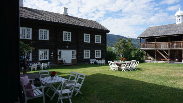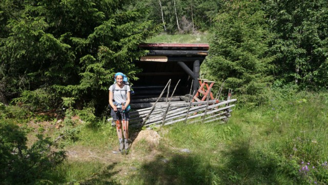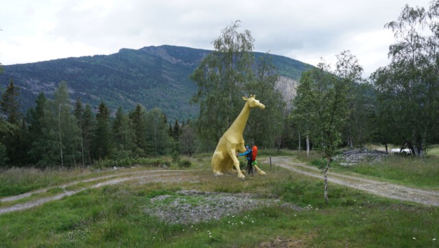 Am sechsten Tag unserer Wanderung brachen wir früh auf. Vorher fragten wir den Hüttenwart, ob er uns einen Tipp geben könnte, wo wir am Abend unser Zelt aufschlagen könnten. Er empfahl uns eine Stelle, die kurz vor der in unserem Wanderführer markierten Giraffenstatue gelegen ist. Mal wieder ging es für uns an der E6 entlang. Irgendwann wurde der Weg zu einem Waldpfad, der uns zur Pilgerherberge Sygard Grytting führte. Dort haben wir uns einen Stempel für unseren Pilgerausweis geholt, nachdem Vika sich einen dicken blauen Fleck holte, weil das große und schwere Eingangsgatter nicht richtig befestigt war und ihr auf das Bein knallte. Aua!