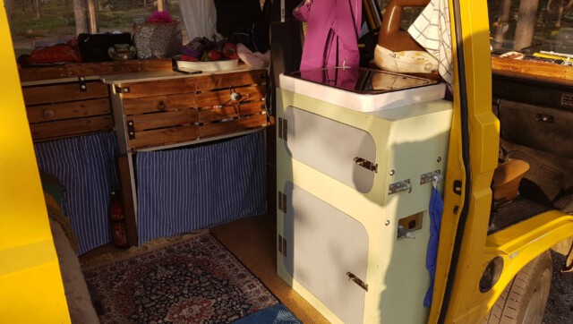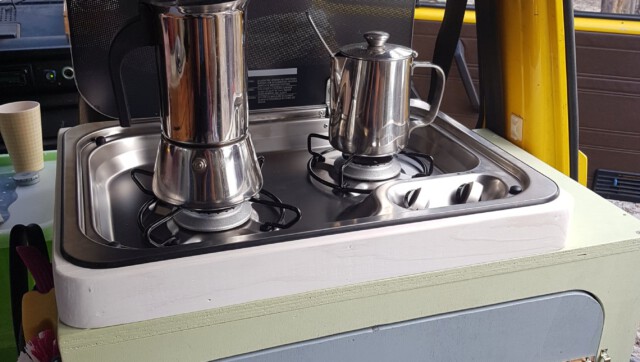 How-auch-ever: eine bessere Lösung musste her. Diesmal entschieden wir uns für einen fest eingebauten Kocher. Das hatte mehrere Gründe. Auf der einen Seite können wir so ‚mal eben schnell‘ einen Kaffee oder Tee machen, ohne erst alles aufbauen zu müssen. Auf der anderen Seite haben wir uns dazu entschlossen, den Kocher in das Küchenschränkchen direkt neben der Schiebetür einzubauen, sodasss auch bei dieser Lösung alle Gerüche und Dämpfe direkt raus ziehen können. Als besonderen Luxus haben wir einen Kocher mit zukappbarem Glasdeckel gekauft, der in geschlossenem Zustand weiterhin als Ablage nutzbar ist. Bestellt haben wir das Teil zu Daniels Ex-Chef Martin, denn wir hatten uns für einen Besuch in seinem Ferienhaus bei Arjeplog bereits verabredet und so konnte er das Paket direkt dorthin mitbringen. How praktisch is that then? 😉