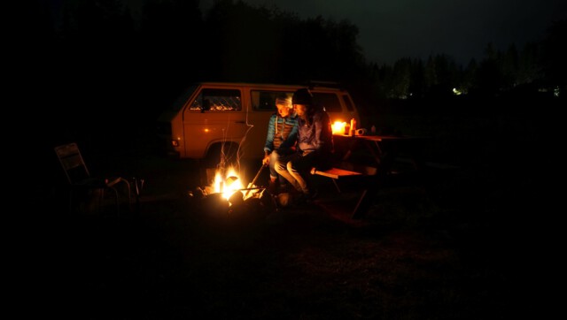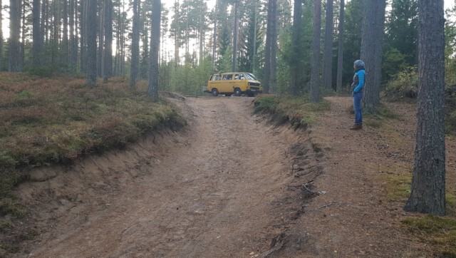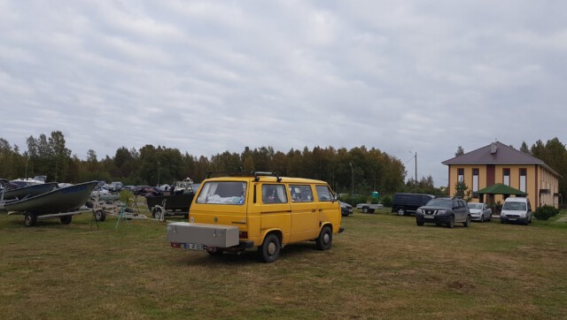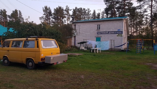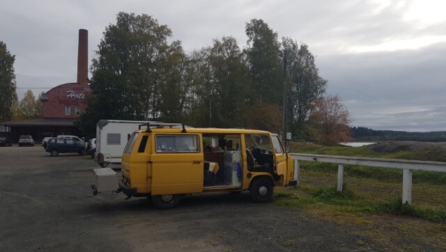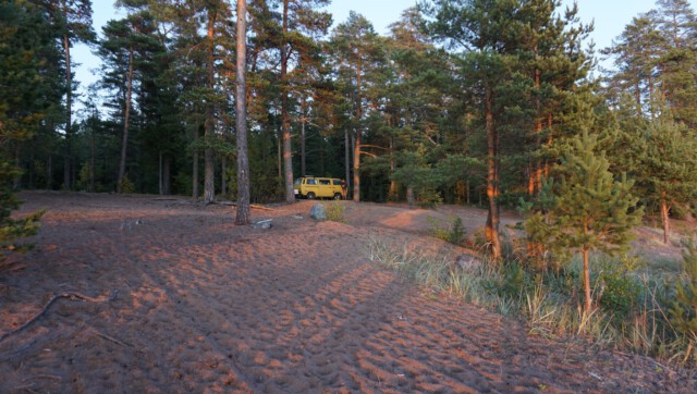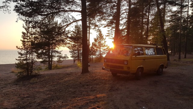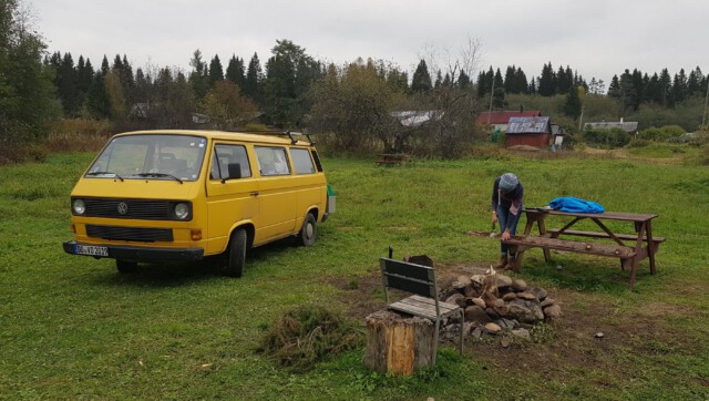 Man sollte wissen, dass sich das mit dem „Van Life“ in Russland nicht so einfach gestaltet: Campingplätze gibt es so gut wie keine und sich einfach mal eben einen Platz zum „Freistehen“ zu finden war auch nicht immer leicht. So fuhren wir bis in die Dunkelheit durch einsame, von Wäldern umschlossene Straßen und suchten einen Platz zum Ankommen und Schlafen. Wie aus dem Nichts tauchte plötzlich ein Grenzposten auf, mit Maschinengewehren ausgestattete Soldaten signalisierten uns, anzuhalten. Unsere Pässe wurden kontrolliert und uns wurden viele Fragen bzgl. des Grundes und des weiteren Verlaufs unserer Reise gestellt. Fotos vom Bulli wurden gemacht und unsere Handynummer notiert. Auf die Frage hin, wozu der ganze Spaß sei, wurde uns versichert, dass es gängige Praxis sei, die der Sicherheit dienen solle. Aha. Nach einigen Tipps zu den Sehenswürdigkeiten der Republik Karelien sowie der Warnung vor den nächtlichen Minusgraden durften wir, äußerst über dieses Zusammentreffen irritiert, weiterfahren. Der Versuch, auf einer von riesigen Schlaglöchern übersähten Straße einen Campingplatz anzusteuern, gab uns den Rest und wir landeten am Ende auf dem tristen Parkplatz eines Hotels, wo wir schließlich die Nacht verbrachten.